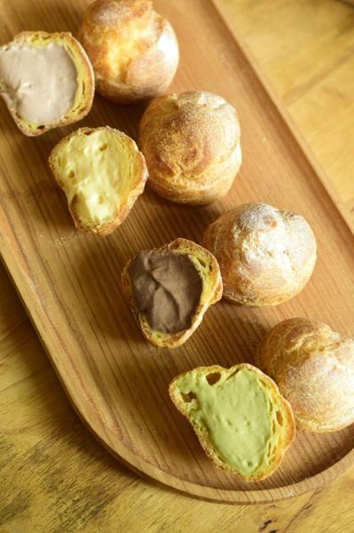 Nhân bánh: trứng gà, bột bắp, sữa, đường, muối, kem tươi, bột matcha, chocolate và quả phúc bồn tử (rasberry)